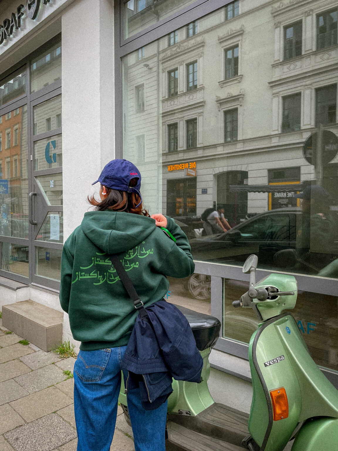 Introducing the British Racing Green Hoodie. The front proudly shows Pakistan's first postal stamp. The back displays Urdu typography of "Made in Pakistan" in Olive green, packed in cropped boxy fit